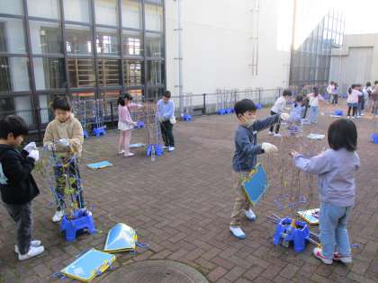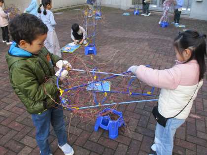 アサガオのつるをリースになるように、輪にしました。友達と協力し合いながら、からまったつるを支柱からはずし、好きな大きさや太さになるように丸めました。つるがなかなかはずれずに困っていると、自然と近くのペアが手伝いに来るなど、助け合う姿が見られました。飾りを付けるのが楽しみです。