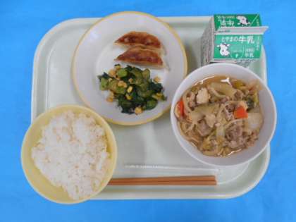 今日のメニューは、ごはん、ぎゅうにゅう、かんこくふうすきやき、コーンあえ、やきぎょうざです。かんこくふうすきやきは、ぶたにく、やきどうふ、たっぷりのやさいでたべごたえがありました。