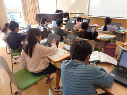 クロム・ブックを用いて、タンタンタンウンの旋律をつくりました。クロム・ブックにド〜ソまでの音を選んで入力し、できた旋律を聴きながら自分でよりよいと思うものを選びました。子供たちは、「きれいな旋律ができた」「この旋律はさわやかに聞こえる」など言いながら、試行錯誤してつくっていました。