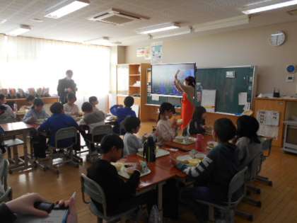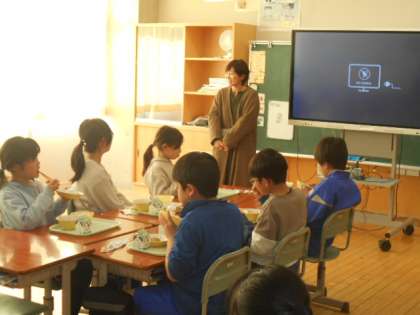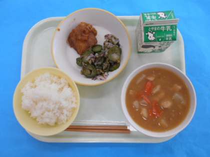 今日のメニューは、ごはん、ぎゅうにゅう、ぶたにくとじゃがいものなんばんに、ゆかりあえ、あげざかなのみそだれです。きょうは、「がっこうきゅうしょく ゆうきの日」です。ほんじつのごはんは、ゆうきまいがつかわれています。ゆうきまいとはなにか、しょくいんがせつめいをしました。そして、そのおこめをつくっている、のうかさんがおもいをはなしてくださいました。こどもたちは、おいしいおこめのために、たくさんのどりょくがあることをしり、「おいしい」といいながらいただいていました。