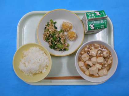 今日のメニューは、ごはん、ぎゅうにゅう、マーボーどうふ、こなつなのだいずそぼろあえ、にんじんシューマイです。だいずのそぼろあえは、まめのしょっかんがあり、おいしくいただきました。