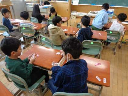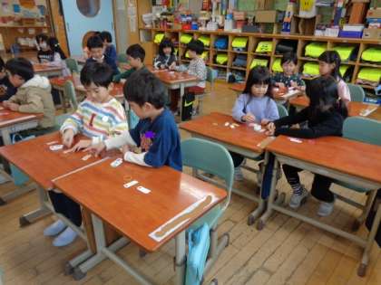 ひきざんカードを用いてゲームをしたり、教科書のQR CODEで読み取った計算練習に取り組んだりしました。ゲームでは、答えが大きい方が勝つけれど、答えを間違えると大きくても負けるルールで、正しく答えようと一生懸命に考えて答えていました。