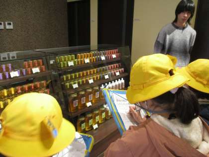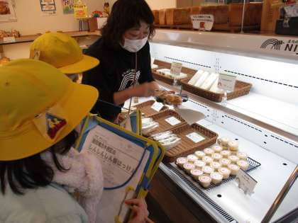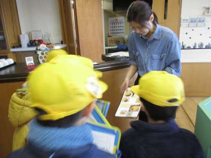 町探検で、地域のお店に行きました。「夏と冬では、お店に違いがあるのかな」「一番人気の商品は何だろう」と子供たちはそれぞれに知りたいことを考えて質問しました。