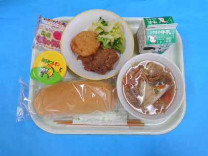 この日はせんたくこんだての日でした。コッペパン、ぎゅうにゅう、ワンタンスープ、そえやさいです。せんたくこんだては、ぶたにくのこめこあげまたはえびカツ、はちみつレモンゼリーまたはモモタルトです。じぶんでえらべるきゅうしょく、こどもたちにとってたのしいじかんだったことでしょう。