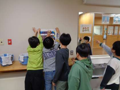 総合的な学習の時間に取り組んでいる「スマイルアップ西田地方」の活動で、挨拶チームが校内にお知らせを貼りました。挨拶のよさを紹介し、挨拶の輪を広げることが目的です。また、給食時間に活動についての報告と挨拶の呼びかけを行いました。元気な挨拶ができる西っ子を目指します。