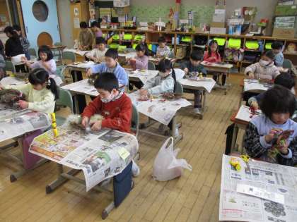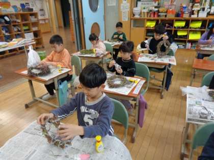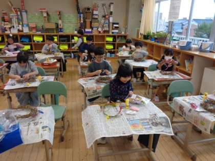 大切に育ててきたあさがおのツルを使って、リースを作りました。子供たちは、各自で持参した材料を使って、思い思いに飾り付け、自分だけのオリジナルリースに仕上げていました。廊下に掲示してありますので個別懇談会の際にご覧ください。