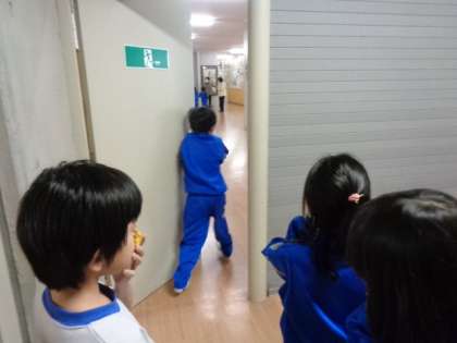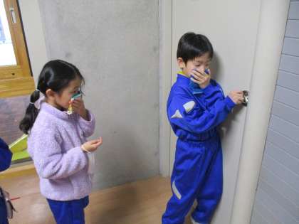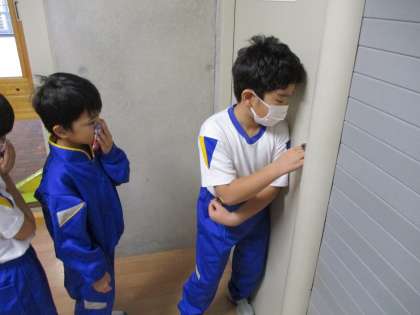 本日の避難訓練では、自分で防火扉を開ける体験をしました。防火扉の重さに苦戦しながらも、体重をかけて一生懸命押していました。
