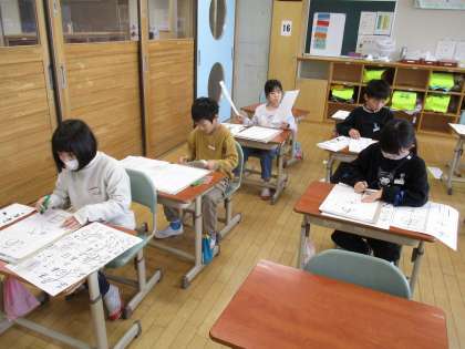 書き初めの手本を見ながら字の形やバランスに気を付けて練習しました。よりよい字になるように、練習の合間に自分の字と手本とを比べて見ています。