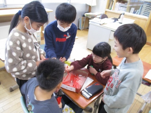 算数の学習では、1000以上の大きな数の数え方について考えました。復習として、今日はたくさんの数え棒をみんなで数え、10の束をつくったり、友達の数えたものを合わせたりしました。
