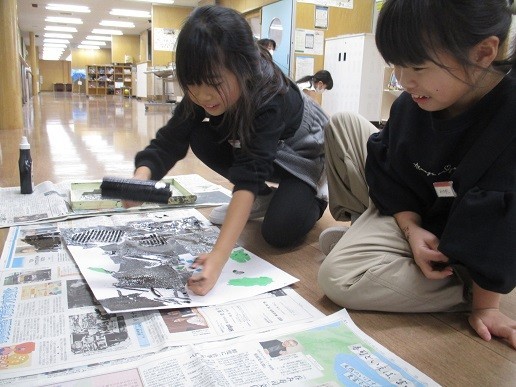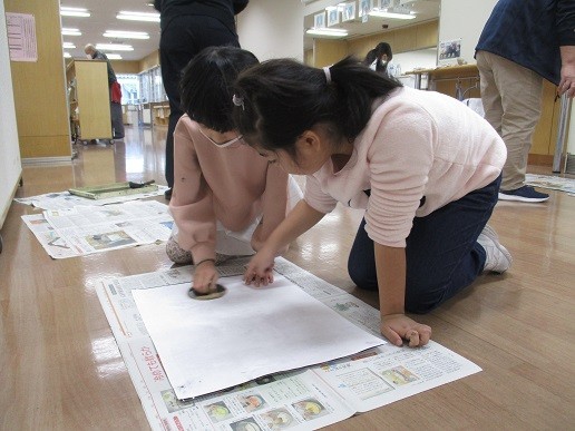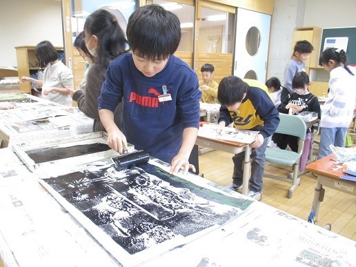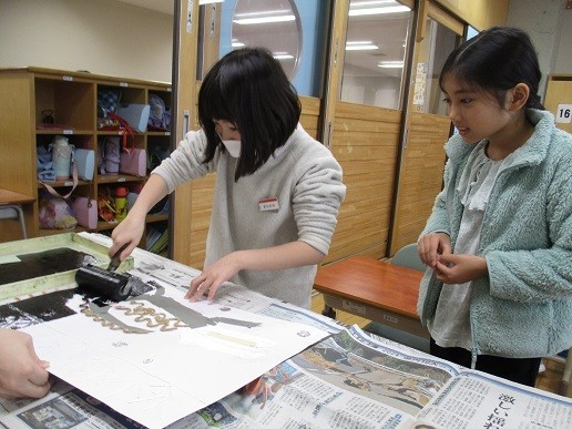 画用紙でつくった版の印刷をしました。紙の重ね方と黒いインクだけで模様が刷り上がる様子に、子供たちは歓声をあげていました。