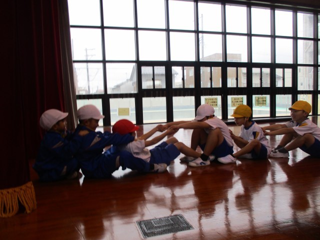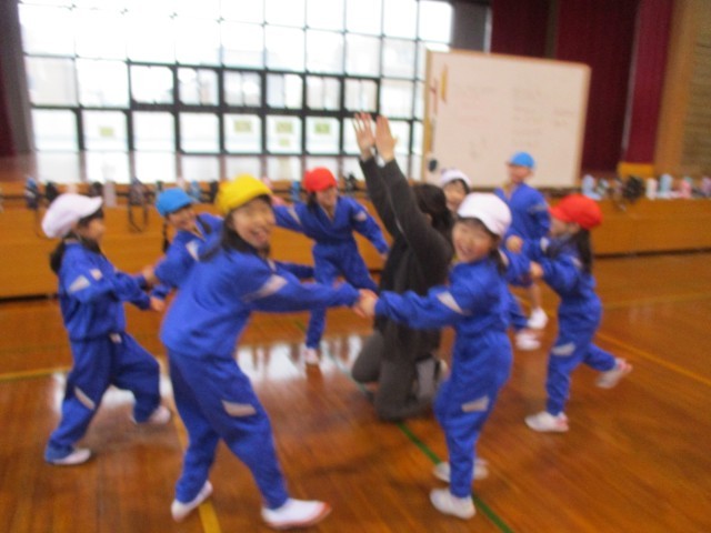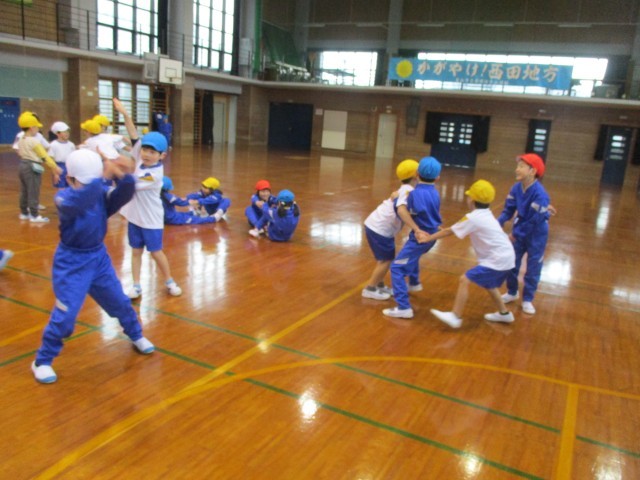前回の「動物園」「水族館」に続き、生き物ではないけれど動きのある、「遊園地の乗り物」を体で表現しました。バイキングやジェットコースター、コーヒーカップ等、様々な乗り物の動きを表現しました。テーマによっては一人では表現しづらい乗り物だと考え、子供たちは自然と集まって表現していました。