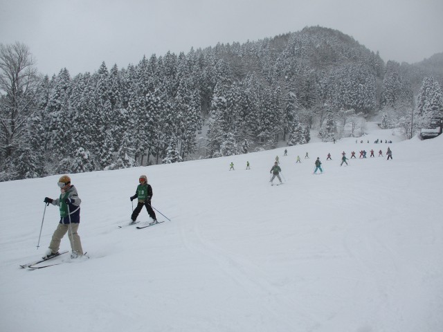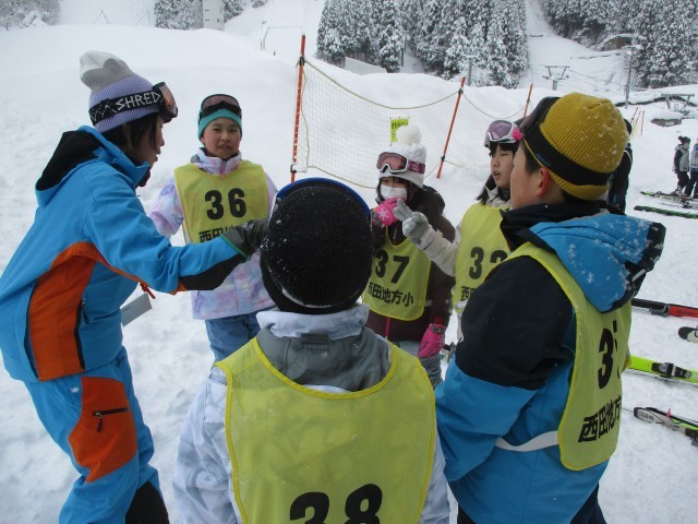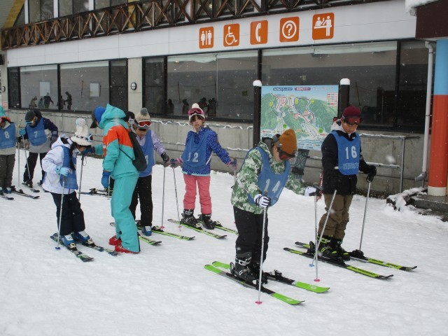 初めてのスキー学習。各班分かれてインストラクターの先生の話をよく聞き、練習が始まりました。雪が降っていましたが、子供たちはいきいきとした表情でスキーを楽しんでいました。