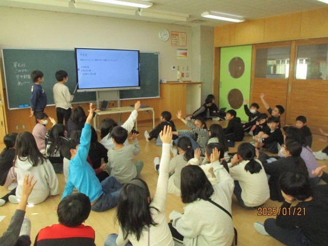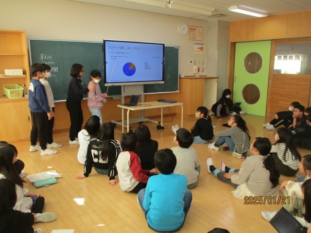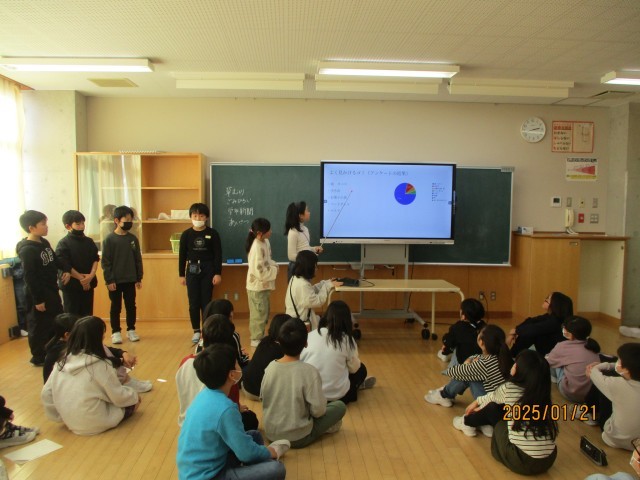 3学期は総合的な学習の時間のまとめとして、グループ毎での活動を実施してきました。その活動報告を他のグループに発表しました。発表を聞いていた子供たちの感想では、「自分たちが使っている公園にごみが多いことを知って、今度からごみを見つけたら拾いたいです」と自分ができることを考えていました。