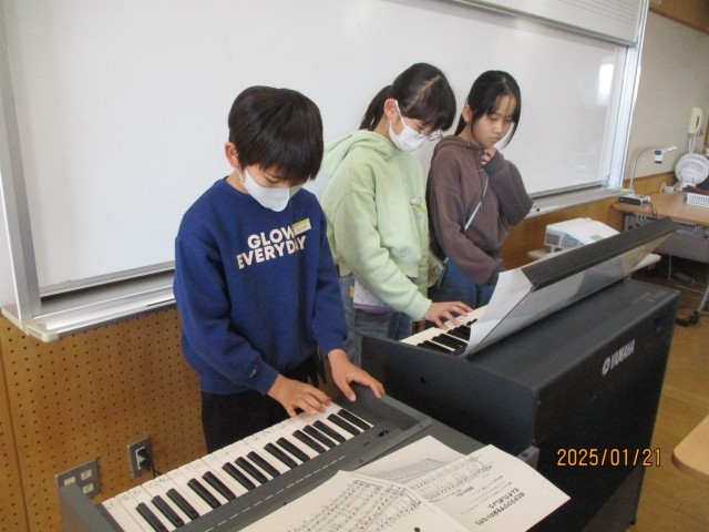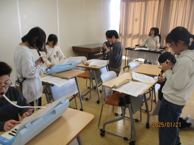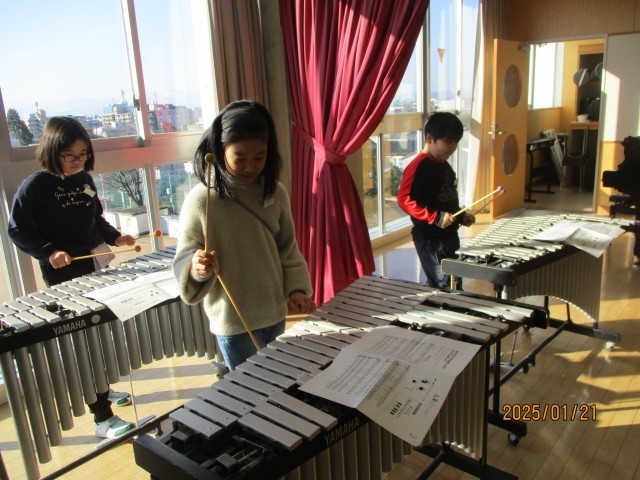 同じパートに分かれて、教え合いながら練習に励んでいます。各パートでは、「ここのリズムはもう少し早いほうがいいね」「弾むようにたたくといいよ」とアドバイスをかけていました。最後の発表会が楽しみですね!