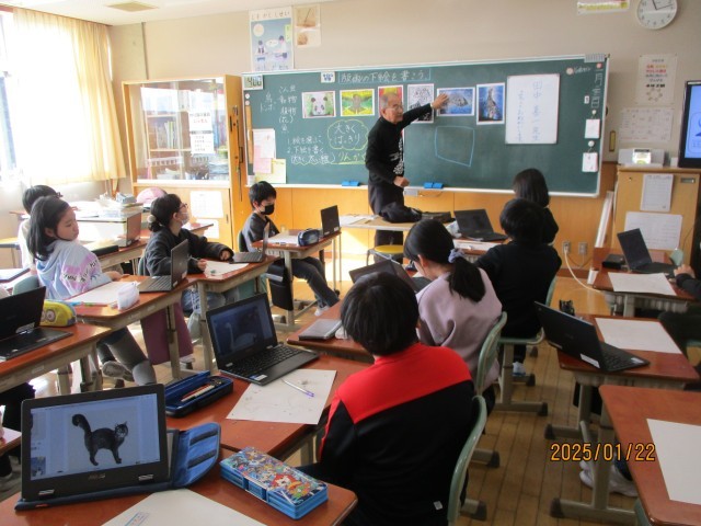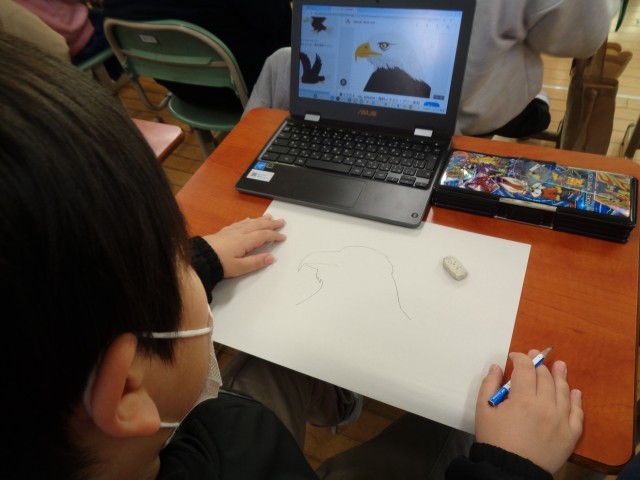 3学期の図工は版画の学習です。今日は、どんなテーマにするのか決めて、下絵作成に取りかかりました。版画の先生に来ていただき、下絵のポイントをいくつも教わりました。クロムブックで調べながら、相談したりアドバイスをもらったりしました。