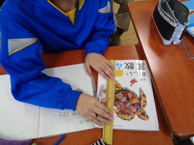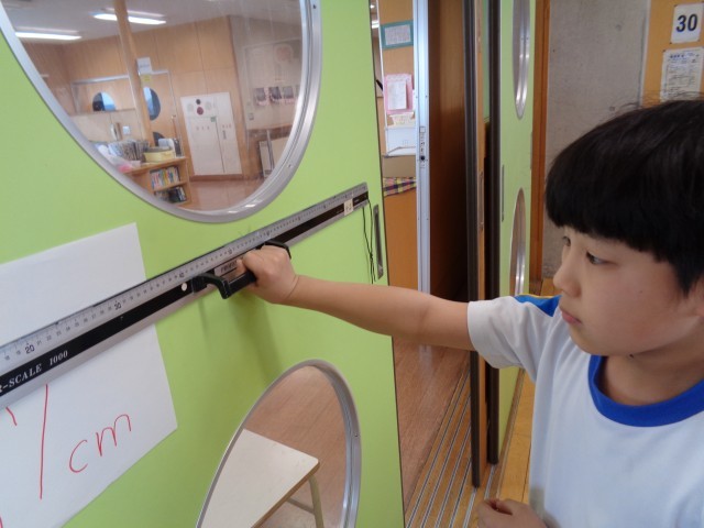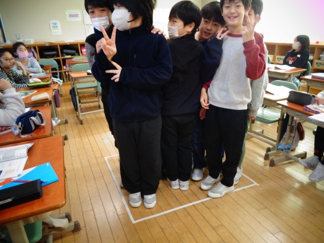 算数では、面積の表し方や求め方を学習しています。テープで1平方メートルの大きさを表し、その中に立ってみたり、教室の扉や教科書の長さを測ったりして、実感しながら面積の単位について学んでいます。