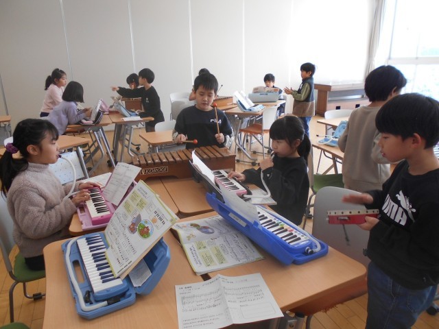音楽科では、「こぐまの二月」の合奏をしています。グループ毎に考えたリズムと、主旋律と低音を担う鍵盤ハーモニカ、副旋律を担う木琴の、4つのパートが息を合わせて、演奏を楽しみました。
