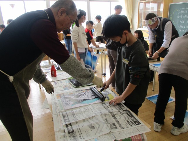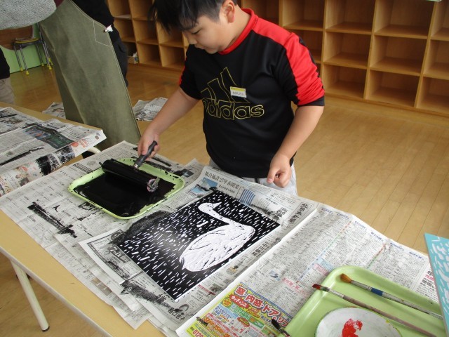 前回の版画の背景を刷った紙に、今回は黒色で主題を刷りました。今回も、版画の先生に指導していただき、刷り上がった作品を見て「うわーきれい」「こんな感じになるんだね」と出来上がりに満足の笑みを浮かべました。
