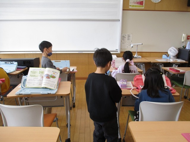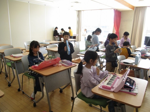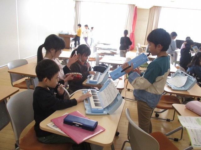 音楽の学習では、「こぐまの二月」の曲をグループで合奏しています。各パートがきれいに合うように声をかけ合って練習しました。