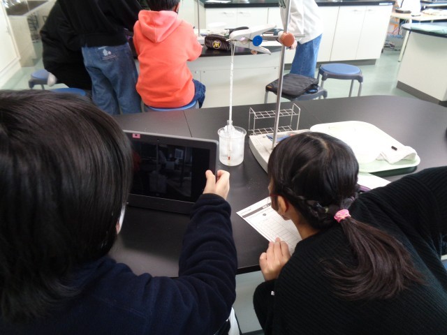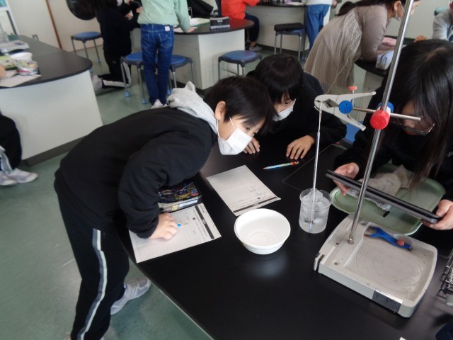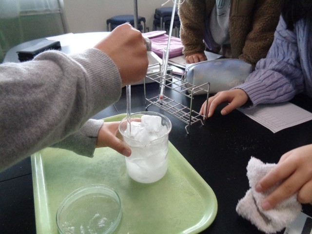 理科の学習で水を冷やしたときの様子について実験・観察をしました。試験管の中の水が凍っていく様子をみて「すごい、白くなってきたよ」「水面が動かないね」とつぶやきました。そして、クロムブックで撮影したものを見ながら、元の水の量の印より上に氷が上がっていることに気付くと「体積は大きくなるんだ」と、驚いている子供たちでした。