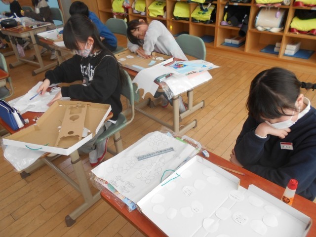 自分で話を作って、みんなで遊ぶゲームをつくっています。話を思い浮かべ、楽しいゲームになるように形や色を考えました。