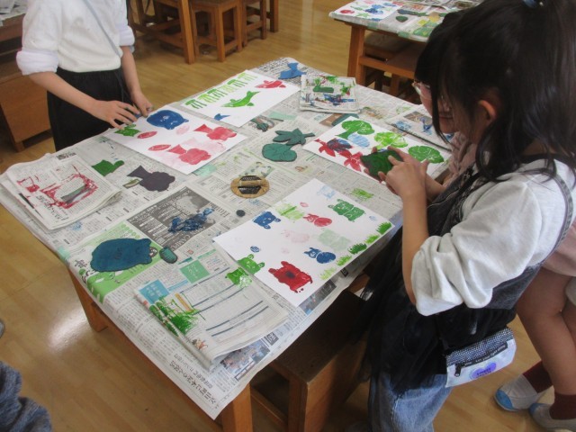 図画工作科では、ゴム版画で動物や植物を様々な形や色で表現しました。重ねて写したり、色や場所を変えて写したりして、自分なりのストーリーを考えて表現しました。