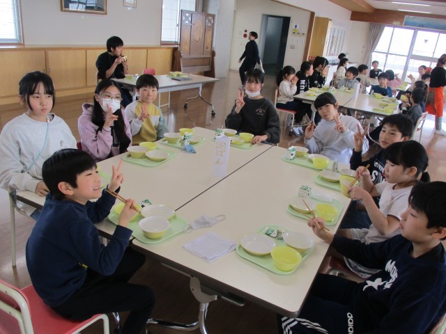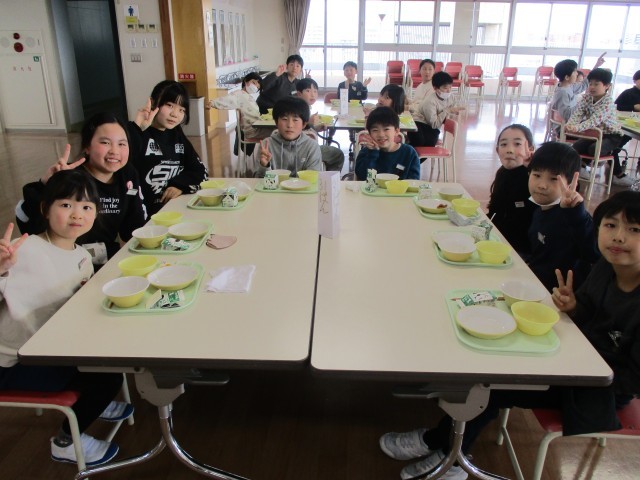 今日は黄団の縦割り会食でした。一緒に話をしながら、縦割り班の人たちと楽しく給食をいただきました。