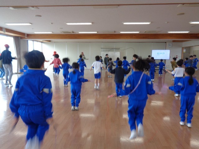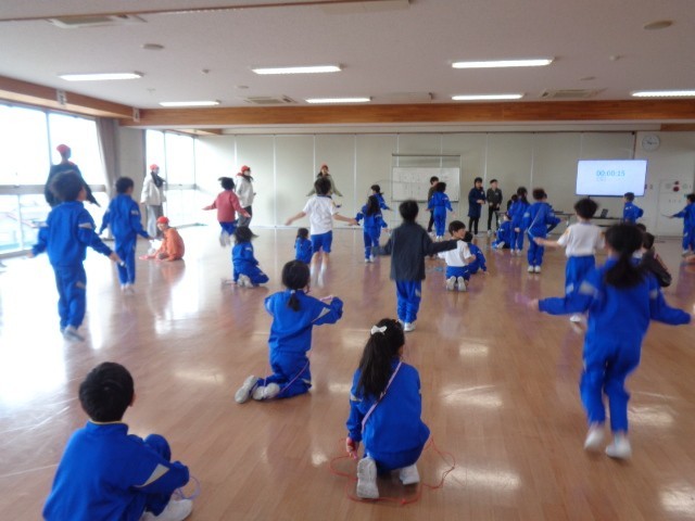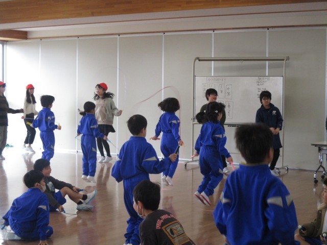 「卒業を祝う週間」のイベントの一つ、「6年生対決」が行われました。それぞれの学年で、対決する種目が異なり、1年生は「前跳び(縄跳び)対決」でした。30秒間、何人跳び続けることができたか、6年生と競いました。「6年生に負けないように がんばるぞ!」とみんなでかけ声をかけて挑んだ勝負。楽しい思い出が、また一つできました。