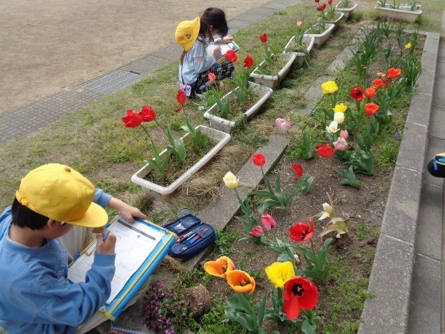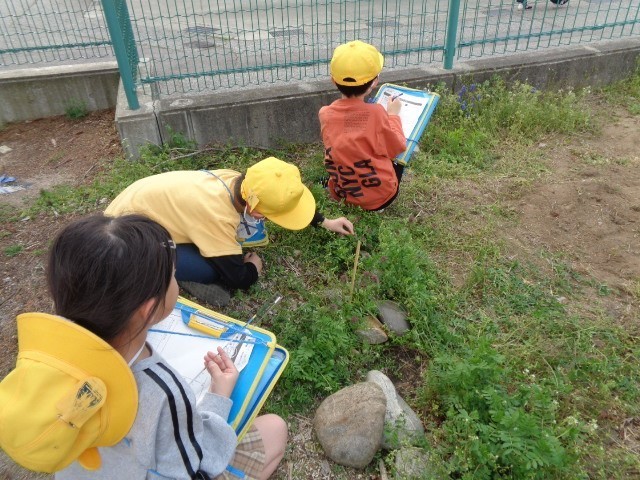 理科では、校庭にある、春に見られるいろいろな植物を探しにいきました。理科の教科書に載っていた「ヒメオドリコソウ」や「ハコベ」等を見付けると、実際の色や形、大きさを、虫眼鏡を使って観察しました。