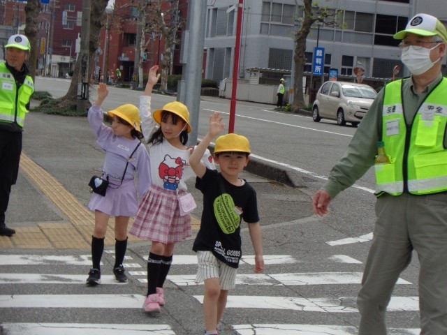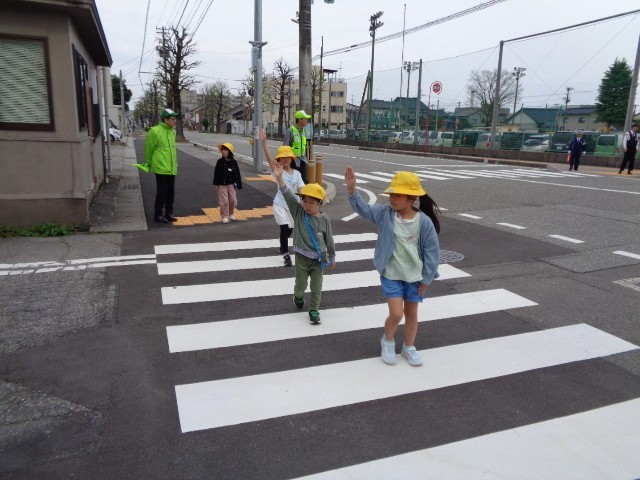 交通安全教室では、みんなの命を守るために気をつけることをたくさん学びました。実際に道路を歩き、気をつけなければいけない場所を確認し、手を挙げながら上手に道路をわたることができました。写真は1組の様子です。