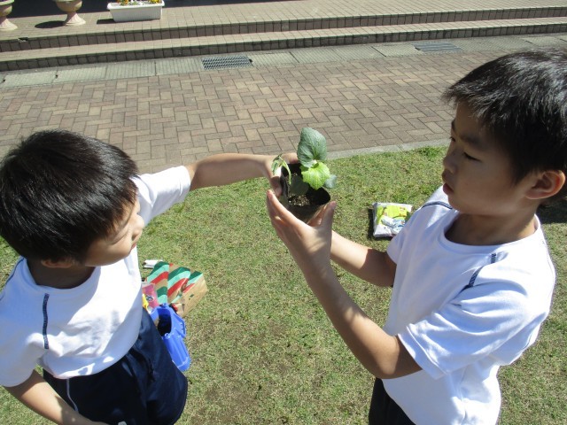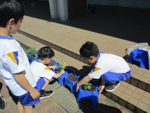 生活科の学習「わたしたちのやさいばたけ」で苗を植えました。子供たちが育てたい野菜の苗を持ってきて鉢に植え替えました。今から夏に向けて収穫が楽しみですね。