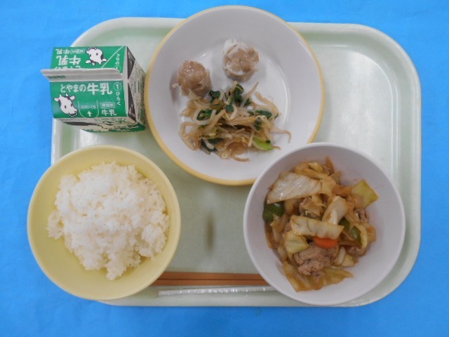 この日のメニューは、ごはん、ぎゅうにゅう、ホイコーロー、こうみあえ、にくシューマイでした。ホイコーローのキャベツ、もりもりとたべることができました。