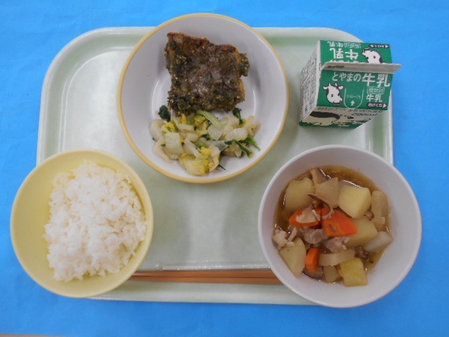 きょうのメニューは、ごはん、ぎゅうにゅう、やまとに、しょうがひたし、ホキのいそべあげです。カラッとあがったほきがとてもこうばしく、おいしくいただきました。