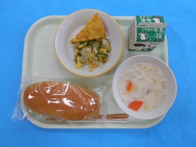 このひのメニューは、コッペパン、ぎゅうにゅう、クリームスープ、コーンサラダ、スパニッシュオムレツでした。まろやかなクリームスープ、とてもおいしかったです。