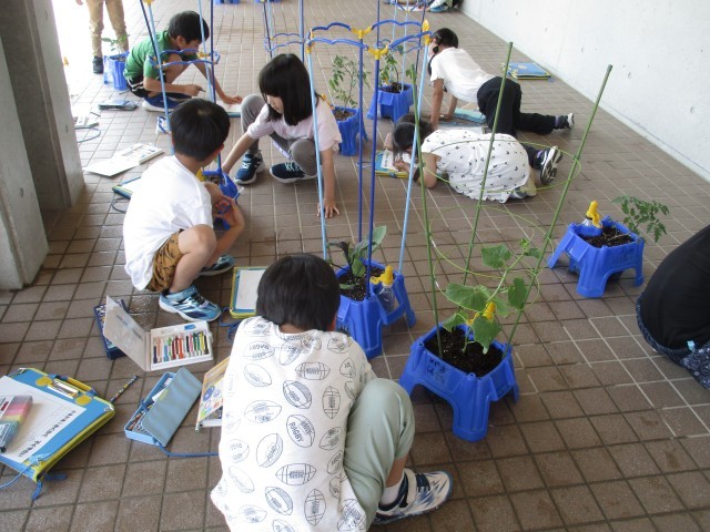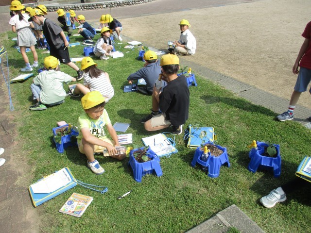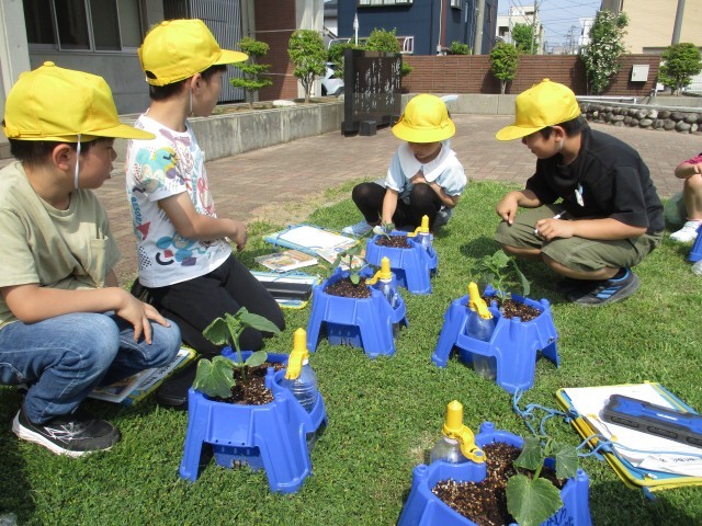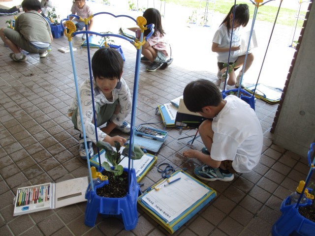 野菜の苗の観察をしました。植えてから1週間。すでに成長をしている様子に驚いたり、風で倒れた苗に困り感を抱いたりと、子供たちも自分の野菜の様子を改めてじっくりと見ることができました。これから起きうる問題にどう向かって対処していくのか、子供たちの取り組む姿勢が楽しみです。