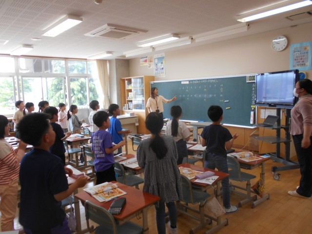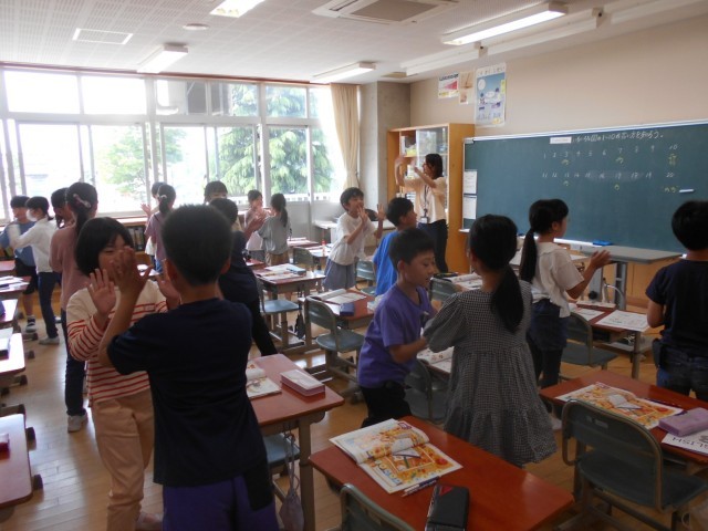 今日の学習では、様々な国の数の数え方を聞き比べました。英語の1から20の数では、ALTに合わせて発音したり、決まった数で体を動かしたりしながら、数の表現に親しみました。