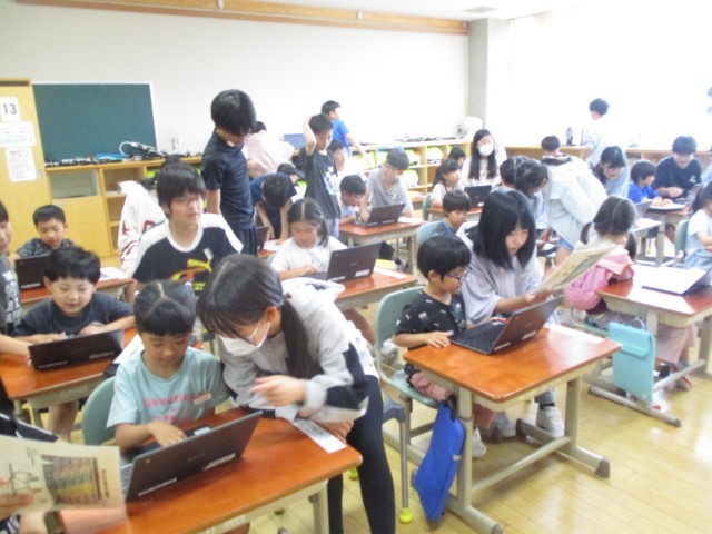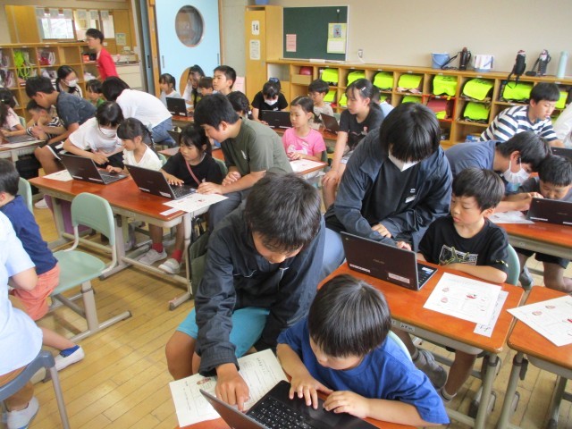 今日は1年生のクロームブック設定のお手伝いをしました。パスワードの入力方法を教えたり、アンケートに一緒に答えたりしました。1年生が自分一人でもログインできるように、一つずつキーボードを指さしながら「これだよ」と優しく教えていました。
