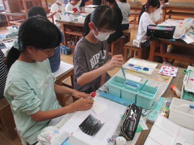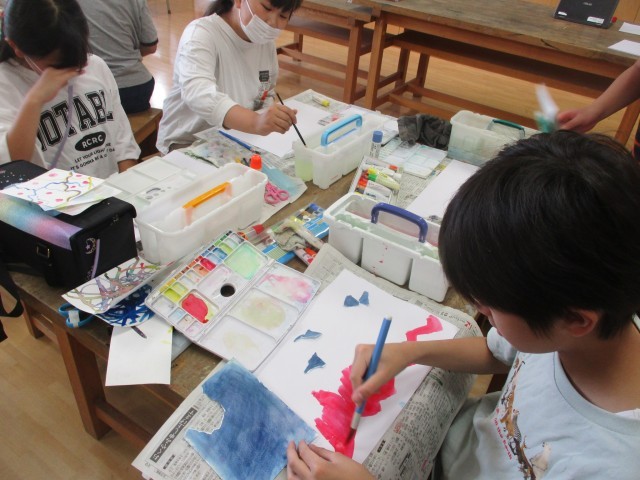 図画工作科「心のもよう」の学習では、前回描いた「心のもよう」カードを基に、組み合わせ方や形、配置を工夫することで、一つの大きな「心のもよう」を描きました。