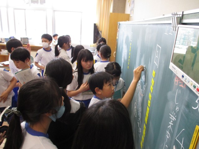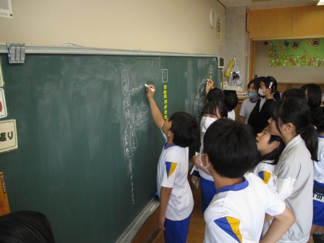 国語科の物語文「銀色の裏地」に登場する、人物の関係図を場面ごとに子供たちで相談しながら作りました。関係図で整理することで主人公の心情の変化に気付くことができました。