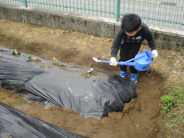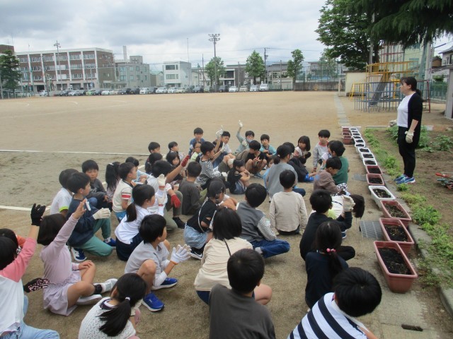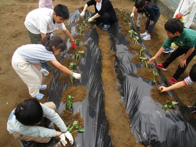 生活科の学習でサツマイモを植えました。1つでも多くのサツマイモが実るように、先生の話をよく聞いて植えることができました。今後の成長が楽しみですね。