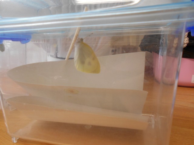 幼虫から育てていたチョウが、成虫になりました。チョウを外に放すと、子供達は飛び立つのを見守りながら、卵から成虫までの成長を喜んでいました。