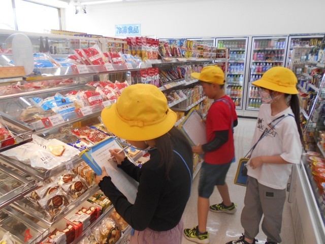 3年生の総合的な学習の時間では、「店とくらしの ぐっと発見」をテーマに、地域の店と自分たちのくらしとのつながりを考えます。今回は、校区にあるコンビニエンスストアの取組を調べました。