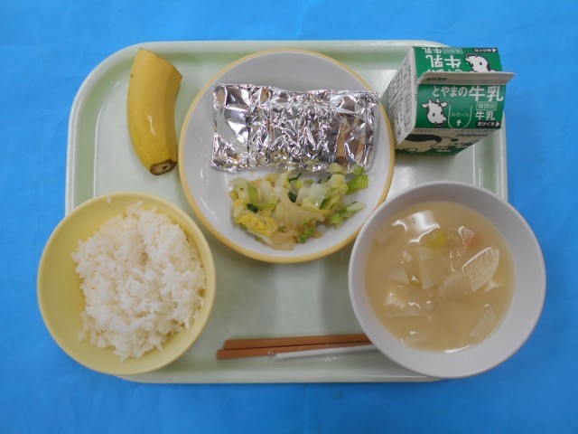 きょうのメニューは、ごはん、ごじる、おひたし、さばのぎんがみやき、バナナです。きょうはきときとランチで、とやまけんのものをつかったメニューとして、ごじるがだされました。ごじるはだいずがつかわれており、えいようたっぷりです。おいしくいただきました。