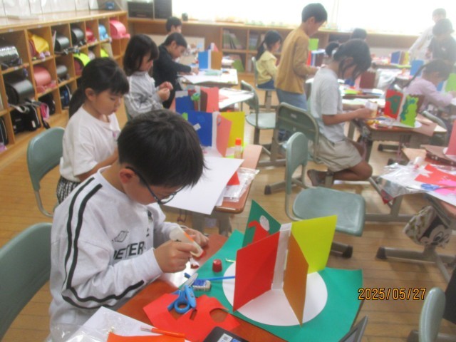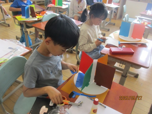 図画工作科では、「動いて楽しいわりピンワールド」という題材で学習しています。
