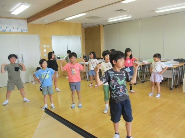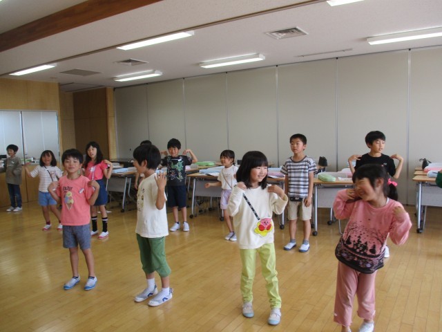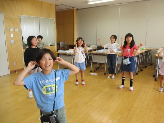 「ドレミのうた」に合わせて、体で音階を表現しました。高い音になるにつれ、手で触れる部分が体の上の方になり、体全体で音階の変化を感じ取りました。曲に合わせて動くことが難しかったのですが、子供達はその難しさを楽しんでいました。