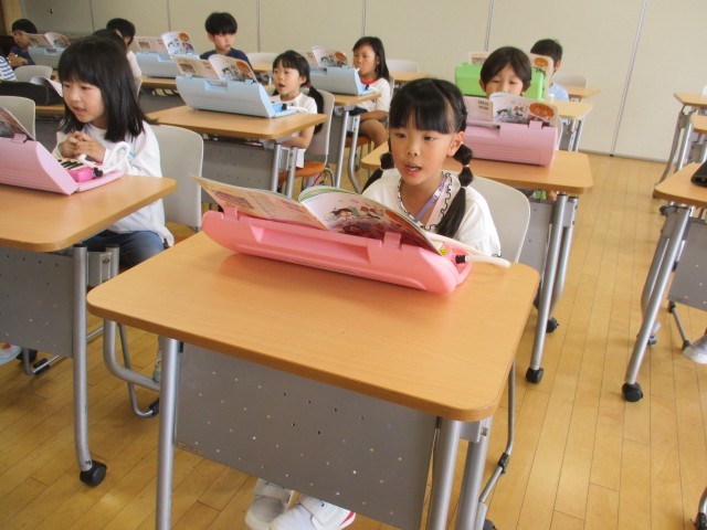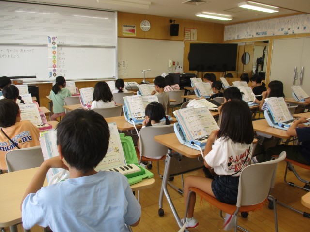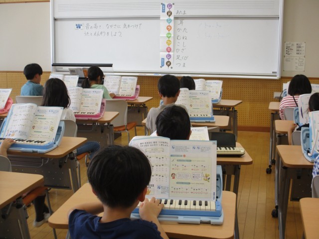 音の高さの変化や息の吹き込みかたを考えながら、鍵盤ハーモニカで「かっこう」を演奏しました。これまでの曲と異なり、音の高さの変化が多く、難しくなってきています。それでも子供たちは、口ずさみながら音の高さを確かめたり、指の動きに気を付けたりしながら、演奏に取り組んでいました。