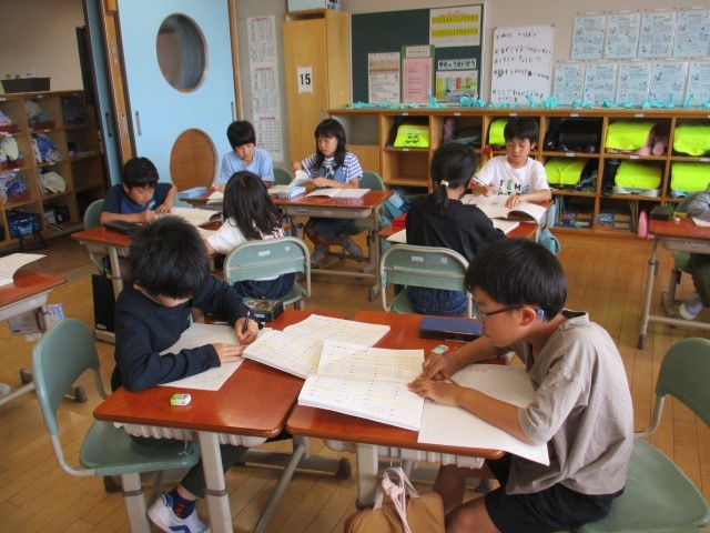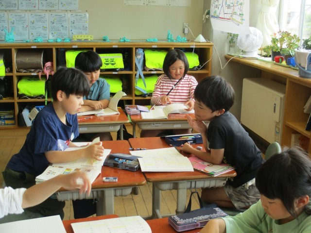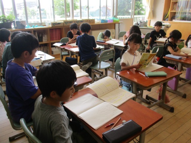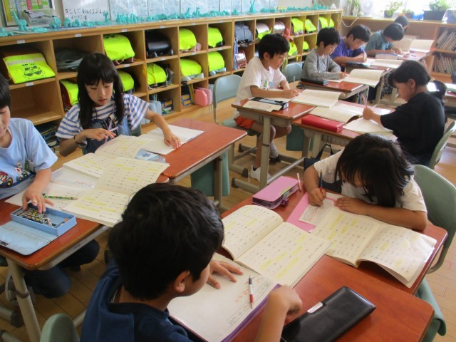 「森」や「林」「本」等、同じ部分をもつ漢字があることを学習しました。他にもそのような漢字がないか、一人で、友達と一緒になど、思い思いの取組方で調べました。教科書の漢字一覧のページを見ながら探し、「口の部分をもつ漢字が25個あったよ」「学年が上がると、同じ部分をもつ漢字はもっと増えるんじゃないかな」「今度はクロム・ブックで調べてみたい」など、意欲的な振り返りをする声も聞かれました。