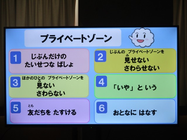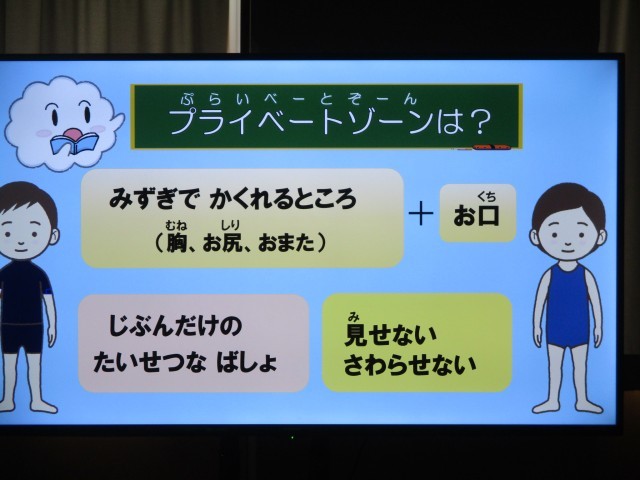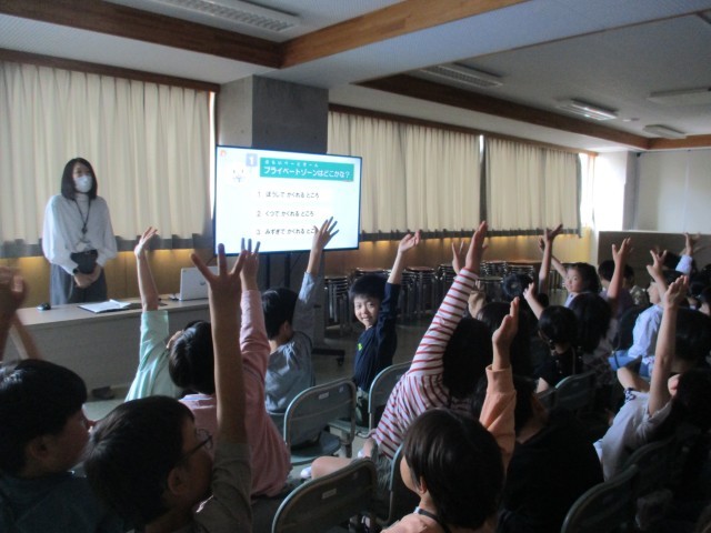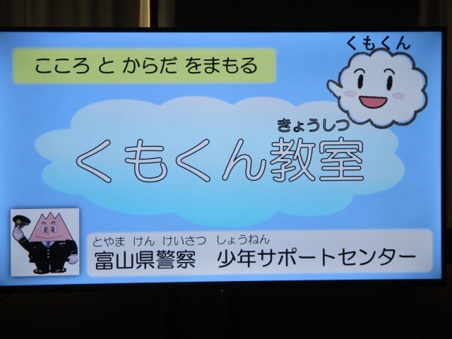 県警少年サポートセンターより、外部講師にお越しいただき「くもくん教室」を行いました。アニメ動画やクイズ等を通して、自分や友達の心身を守るために大切なことを聴きました。