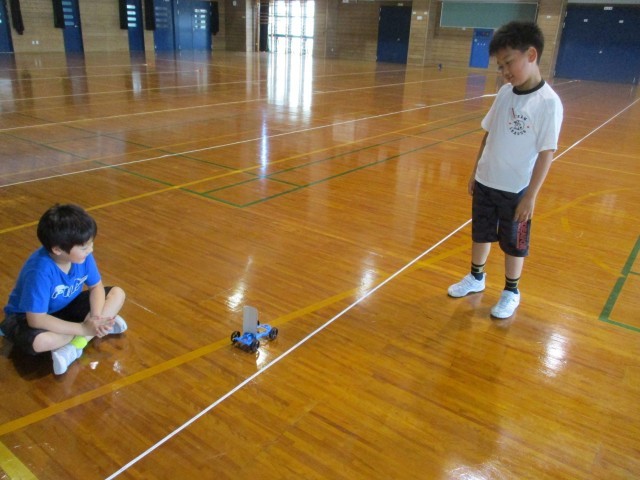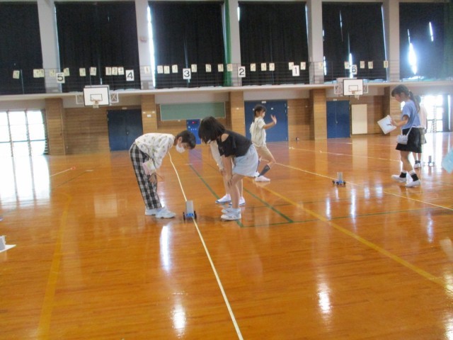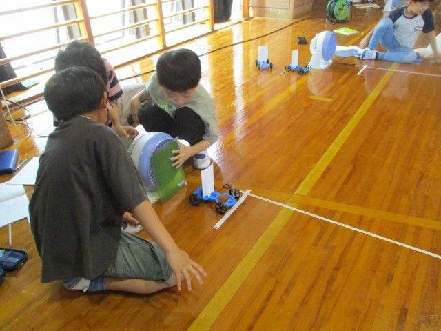 送風機を使って、風の強さによる車の動き方の違いを調べました。実験結果の数値が違うことに気付き、繰り返し実験することや同じ条件にすることの必要性を感じていました。