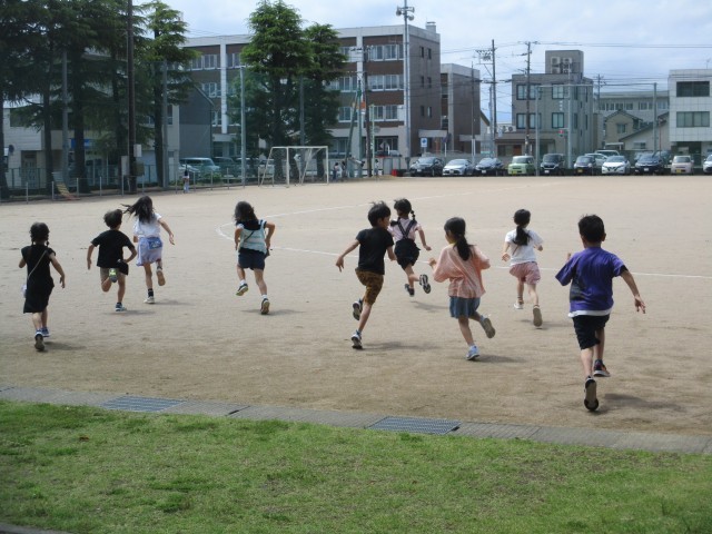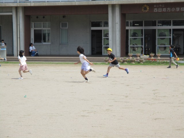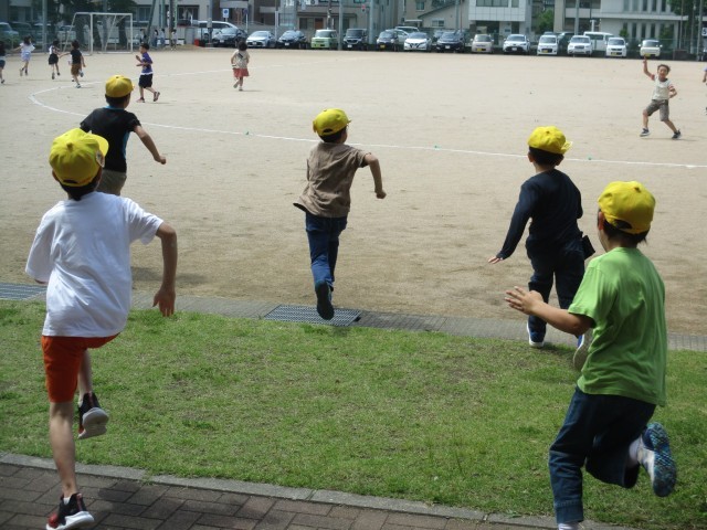 1組のスポーツ係が、いきいきタイムに「氷鬼ごっこをしよう」と呼びかけました。「やりたい」と2組も参加し、仲よく元気にグラウンドを走り回りました。